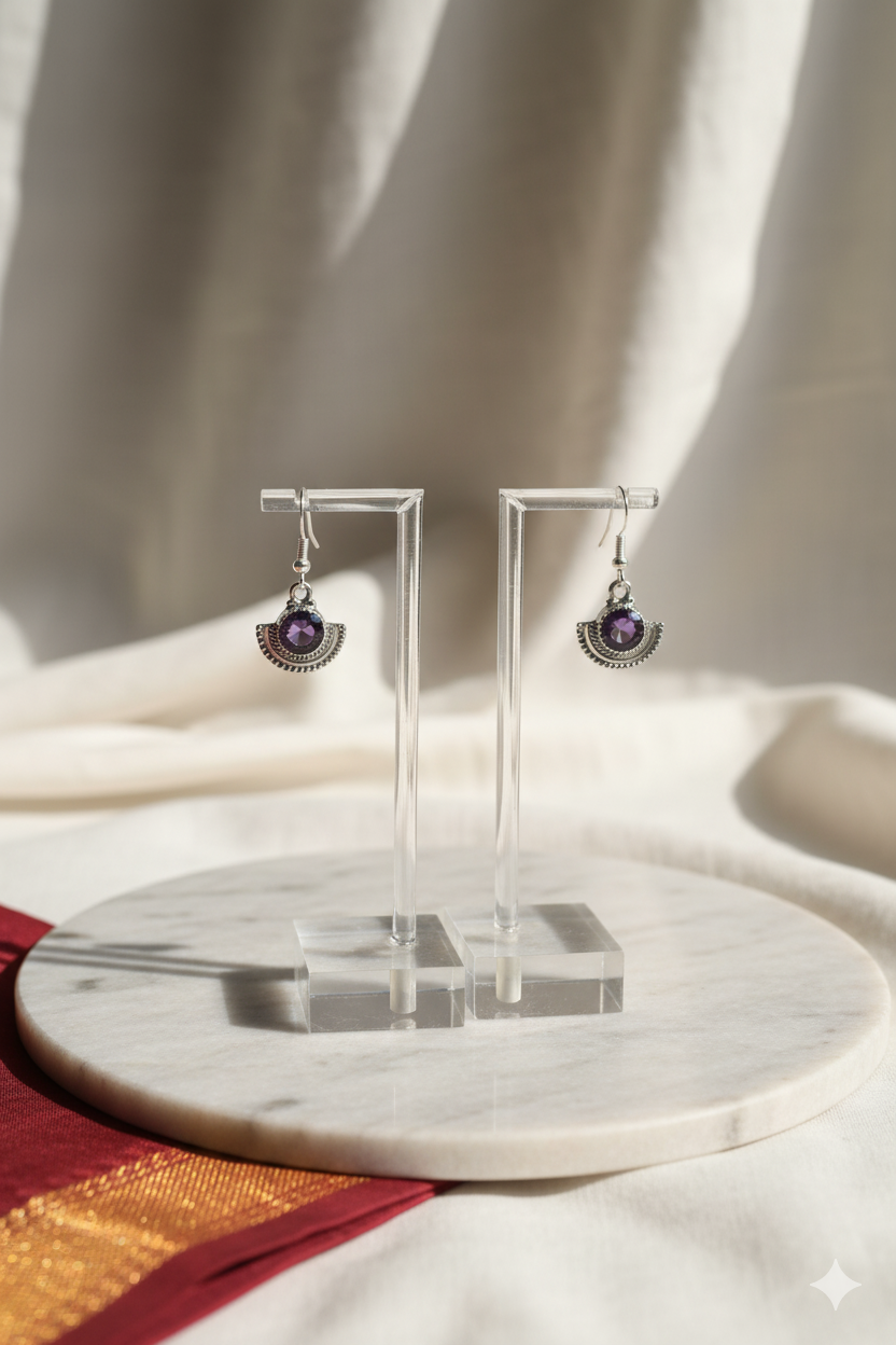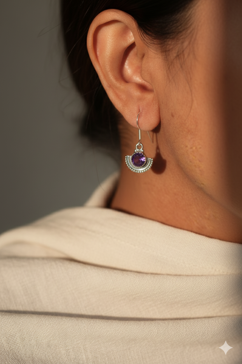 Expertly handcrafted from premium 925 sterling silver featuring genuine amethyst gemstones prized for their stunning purple hues and natural crystal clarity. Master Indian artisans employ traditional techniques to create the intricate mandala-inspired filigree work, with each concentric circle and geometric pattern meticulously hand-carved. The teardrop amethyst stones are carefully selected and precisely set to showcase their distinctive violet brilliance. Each earring undergoes detailed finishing with secure French hook ear wires for comfortable, reliable wear.
